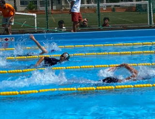 と優秀な成績を残しました。夏休みの水泳教室前の朝練習を毎日のように頑張りました。少ない人数でしたが、今の自分を乗り越えたいと精一杯練習に取り組みました。特にリレーは、仲間たちの頑張りを最後まで信じ、『信は力なり』を体現するような気持ちのこもった泳ぎでした。