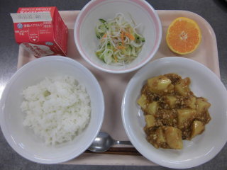 <食材の産地> じゃが芋・・・北海道 しょうが・・・熊本県 にんじん・・・北海道 玉ねぎ・・・北海道 キャベツ・・・千葉県 もやし・・・栃木県 きゅうり・・・埼玉県 みかん・・・長崎県 ※牛乳は、茨城県・千葉県・群馬県・栃木県・北海道・山形県・宮城県の原乳を使用しています。 ※現在出荷制限されている食材については、給食に使用していません。