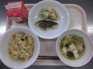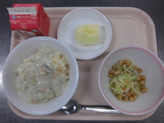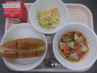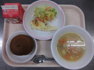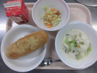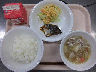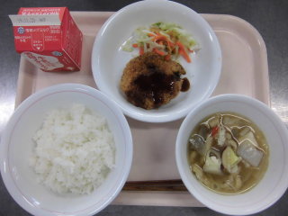<食材の産地> かぶ・・・千葉県 にんじん・・・北海道 玉ねぎ・・・北海道 しめじ・・・長野県 しょうが・・・熊本県 もやし・・・栃木県 キャベツ・・・茨城県 ※牛乳は、茨城県・千葉県・群馬県・栃木県・北海道・山形県・宮城県の原乳を使用しています。 ※現在出荷制限されている食材については、給食に使用していません。