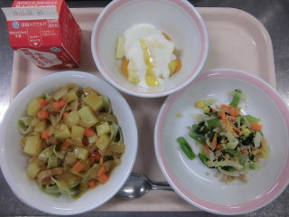 <食材の産地> 小松菜…足立区 じゃが芋…北海道 にんじん…千葉県 玉ねぎ…北海道 いんげん…長崎県 キャベツ…千葉県 もやし…栃木県 ※牛乳は、茨城県・千葉県・群馬県・栃木県・北海道・山形県・宮城県の原乳を使用しています。 ※現在出荷制限されている食材については、給食にしようしていません。