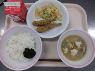 <食材の産地> キャベツ・・・茨城県 もやし・・・栃木県 にんじん・・・千葉県 レモン・・・愛媛県 ごぼう・・・青森県 だいこん・・・千葉県 さといも・・・栃木県 長ねぎ・・・岩手県 ※牛乳は、茨城県・千葉県・群馬県・栃木県・北海道・山形県・宮城県の原乳を使用しています。 ※現在出荷制限されている食材については、給食に使用していません。