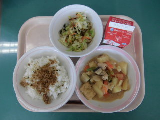 <食材の産地> にんじん・・・千葉県 えりんぎ・・・長野県 玉ねぎ・・・北海道 しょうが・・・熊本県 パセリ・・・千葉県 キャベツ・・・千葉県 もやし・・・栃木県 りんご・・・長野県 ※牛乳は、茨城県・千葉県・群馬県・栃木県・北海道・山形県・宮城県の原乳を使用しています。 ※現在出荷制限されている食材については、給食にしようしていません。