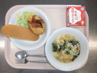 | 柏パン おみくじコロッケ ボイルキャベツ 洋風たまごスープ 牛乳 |