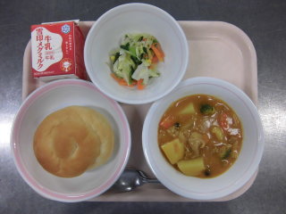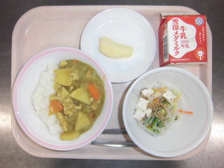 | チキンカレーライス 豆腐入りサラダ りんご 牛乳 |
