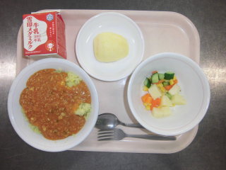 | ごはん 鮭ふりかけ じゃがいものそぼろ煮 切干大根のサラダ 牛乳 |