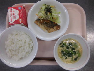 | ごはん 魚のねぎ味噌焼き のり和え かきたま汁 牛乳 |