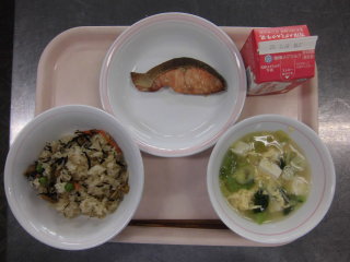 | 大豆入りひじきごはん 魚のレモン焼き 豆腐とたまごのスープ 牛乳 |