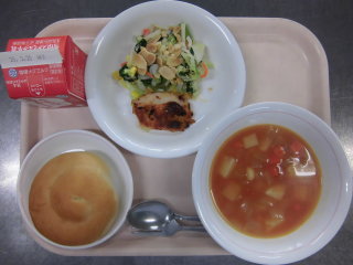 | ショートニングパン タンドリーチキン フレンチサラダ ミネストローネ 牛乳 |