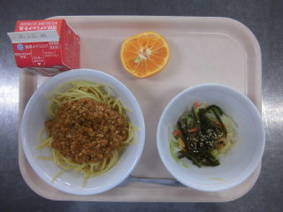 | ミートソーススパゲティ 茎わかめサラダ 菊花みかん 牛乳 |