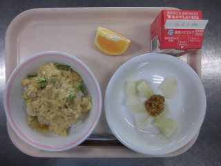 | 親子丼 肉味噌田楽 いよかん 牛乳 |