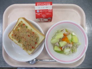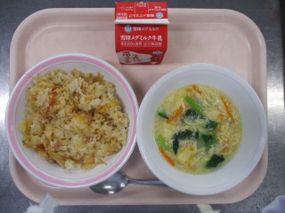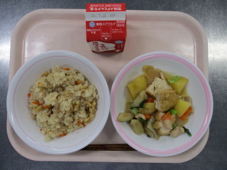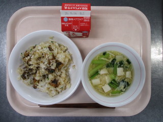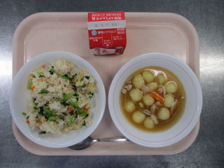 | 小松菜と鮭の混ぜご飯 じゃがもちスープ 牛乳 |