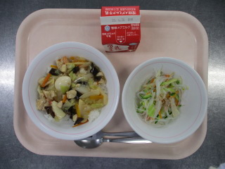 | 焼き鳥丼 いかともやしの和え物 牛乳 |