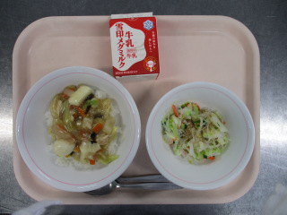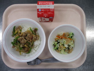 | チンジャオロース丼 ツナサラダ 牛乳 |