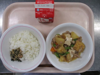 | ごはん 鮭ふりかけ 肉じゃが 牛乳 |