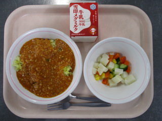 | チリビーンズライス マセドアンサラダ 牛乳 |