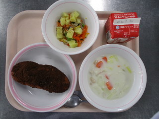 <食材の産地> 小松菜・・・足立区産 じゃが芋・・・北海道 玉葱・・・北海道 にんじん・・・千葉県 キャベツ・・・愛知県 白菜・・・茨城県 セロリー・・・愛知県 生姜・・・熊本県 パセリ・・・愛知県 ※牛乳は、茨城県・千葉県・群馬県・栃木県・北海道・山形県・宮城県の原乳を使用しています。 ※現在出荷制限されている食材については、給食に使用していません。
