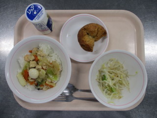 <食材の産地> じゃが芋・・・北海道 玉葱・・・北海道 にんじん・・・千葉県 生姜・・・熊本県 にんにく・・・青森県 もやし・・・栃木県 キャベツ・・・千葉県 りんご・・・山形県 ※牛乳は、茨城県・千葉県・群馬県・栃木県・北海道・山形県・宮城県の原乳を使用しています。 ※現在出荷制限されている食材については、給食に使用していません。