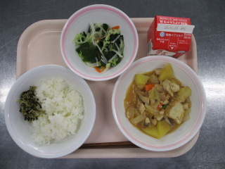 <食材の産地> じゃが芋・・・北海道 にんじん・・・北海道 玉葱・・・北海道 いんげん・・・長崎県 キャベツ・・・千葉県 もやし・・・栃木県 レモン・・・愛媛県 ※牛乳は、茨城県・千葉県・群馬県・栃木県・北海道・山形県・宮城県の原乳を使用しています。 ※現在出荷制限されている食材については、給食に使用していません。