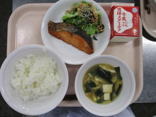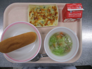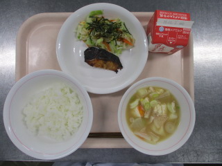 <食材の産地> 小松菜・・・栃木県 にんにく・・・青森県 パセリ・・・千葉県 じゃが芋・・・北海道 玉葱・・・北海道 にんじん・・・北海道 キャベツ・・・千葉県 レモン・・・愛媛県 ※牛乳は、茨城県・千葉県・群馬県・栃木県・北海道・山形県・宮城県の原乳を使用しています。 ※現在出荷制限されている食材については、給食に使用していません。