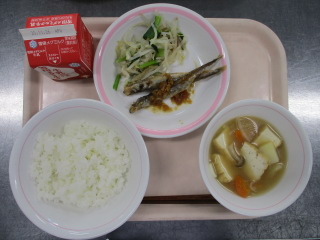 <食材の産地> 小松菜・・・足立区産 ごぼう・・・青森県 玉葱・・・北海道 にんじん・・・千葉県 生姜・・・熊本県 もやし・・・栃木県 キャベツ・・・愛知県 大根・・・千葉県 さつま芋・・・千葉県 ねぎ・・・岩手県 ※牛乳は、茨城県・千葉県・群馬県・栃木県・北海道・山形県・宮城県の原乳を使用しています。 ※現在出荷制限されている食材については、給食に使用していません。
