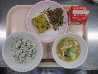 <食材の産地> 小松菜・・・足立区産 にんじん・・・千葉県 玉葱・・・北海道 糸みつ葉・・・千葉県 ごぼう・・・青森県 レンコン・・・茨城県 いんげん・・・長崎県 じゃが芋・・・北海道 ねぎ・・・岩手県 ※牛乳は、茨城県・千葉県・群馬県・栃木県・北海道・山形県・宮城県の原乳を使用しています。 ※現在出荷制限されている食材については、給食に使用していません。