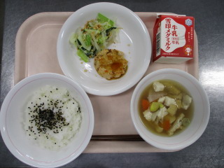 <食材の産地> 小松菜・・・足立区産 玉葱・・・北海道 レンコン・・・茨城県 にんじん・・・北海道 えのき・・・新潟県 小ねぎ・・・静岡県 もやし・・・栃木県 キャベツ・・・群馬県 さつま芋・・・千葉県 ねぎ・・・岩手県 ※牛乳は、茨城県・千葉県・群馬県・栃木県・北海道・山形県・宮城県の原乳を使用しています。 ※現在出荷制限されている食材については、給食に使用していません。