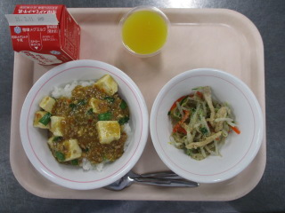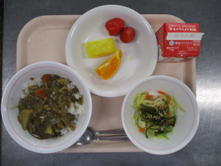<食材の産地> にんじん・・・千葉県 キャベツ・・・愛知県 玉葱・・・北海道 もやし・・・栃木県 ねぎ・・・千葉県 チンゲン菜・・・茨城県 生姜・・・熊本県 じゃが芋・・・鹿児島県 ※牛乳は、茨城県・千葉県・群馬県・栃木県・北海道・山形県・宮城県の原乳を使用しています。 ※現在出荷制限されている食材については、給食に使用していません。
