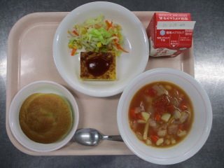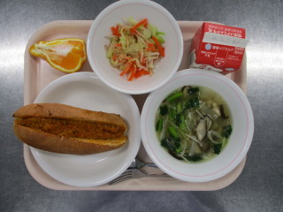 <食材の産地> 玉葱・・・北海道 パセリ・・・静岡県 もやし・・・栃木県 キャベツ・・・愛知県 生姜・・・熊本県 にんじん・・・千葉県 じゃが芋・・・鹿児島県 セロリー・・・福岡県 ニンニク・・・青森県 りんご・・・青森県 ※牛乳は、茨城県・千葉県・群馬県・栃木県・北海道・山形県・宮城県の原乳を使用しています。 ※現在出荷制限されている食材については、給食に使用していません。