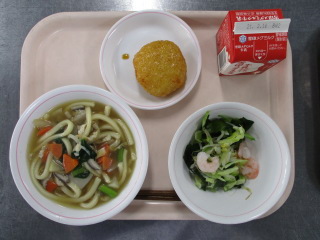 <食材の産地> 小松菜・・・足立区産 にんじん・・・千葉県 大根・・・千葉県 ごぼう・・・茨城県 ねぎ・・・千葉県 じゃが芋・・・鹿児島県 キャベツ・・・愛知県 もやし・・・栃木県 ※牛乳は、茨城県・千葉県・群馬県・栃木県・北海道・山形県・宮城県の原乳を使用しています。 ※現在出荷制限されている食材については、給食に使用していません。