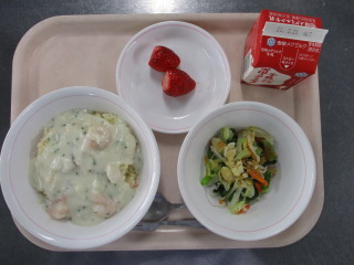 <食材の産地> 小松菜・・・足立区産 にんじん・・・千葉県 玉葱・・・北海道 白菜・・・茨城県 パセリ・・・静岡県 生姜・・・熊本県 じゃが芋・・・鹿児島県 苺・・・福岡県 ※牛乳は、茨城県・千葉県・群馬県・栃木県・北海道・山形県・宮城県の原乳を使用しています。 ※現在出荷制限されている食材については、給食に使用していません。
