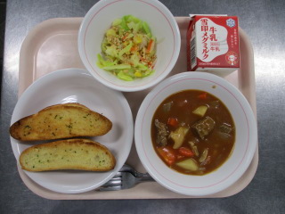 <食材の産地> にんにく・・・青森県 パセリ・・・静岡県 じゃが芋・・・北海道 にんじん・・・千葉県 玉葱・・・北海道 生姜・・・熊本県 もやし・・・栃木県 キャベツ・・・愛知県 ※牛乳は、茨城県・千葉県・群馬県・栃木県・北海道・山形県・宮城県の原乳を使用しています。 ※現在出荷制限されている食材については、給食に使用していません。