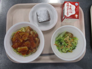 <食材の産地> 小松菜・・・足立区産 玉葱・・・北海道 エリンギ・・・新潟県 ニンニク・・・青森県 キャベツ・・・愛知県 にんじん・・・千葉県 ※牛乳は、茨城県・千葉県・群馬県・栃木県・北海道・山形県・宮城県の原乳を使用しています。 ※現在出荷制限されている食材については、給食に使用していません。
