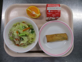 <食材の産地> にんじん・・・千葉県 じゃが芋・・・北海道 大根・・・神奈川県 キャベツ・・・愛知県 もやし・・・栃木県 レモン・・・広島県 せとか・・・愛媛県 ※牛乳は、茨城県・千葉県・群馬県・栃木県・北海道・山形県・宮城県の原乳を使用しています。 ※現在出荷制限されている食材については、給食に使用していません。