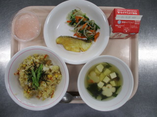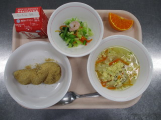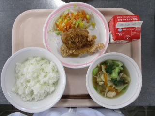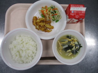 <食材の産地> にんじん・・・愛媛県 さやえんどう・・・鹿児島県 レモン・・・愛媛県 もやし・・・栃木県 ほうれん草・・・埼玉県 ぶなしめじ・・・長野県 長ねぎ・・・千葉県 ※牛乳は、茨城県・千葉県・群馬県・栃木県・北海道・山形県・宮城県の原乳を使用しています。 ※現在出荷制限されている食材については、給食に使用していません。
