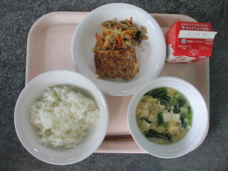 <食材の産地> にんにく・・・青森県 玉葱・・・北海道 にんじん・・・愛知県 しめじ・・・長野県 生姜・・・熊本県 キャベツ・・・愛知県 レモン・・・愛媛県 ※牛乳は、茨城県・千葉県・群馬県・栃木県・北海道・山形県・宮城県の原乳を使用しています。 ※現在出荷制限されている食材については、給食に使用していません。