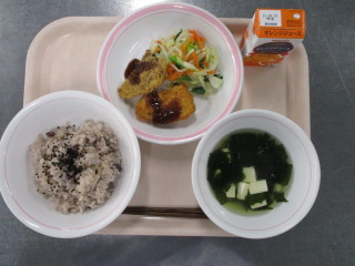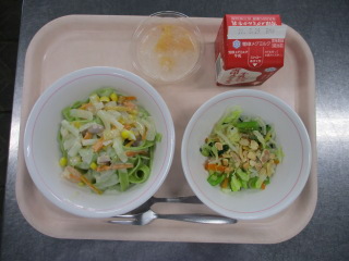 <食材の産地> にんじん・・・愛知県 キャベツ・・・愛知県 玉葱・・・北海道 生姜・・・熊本県 もやし・・・栃木県 きゅうり・・・茨城県 デコポン・・・熊本県 ※牛乳は、茨城県・千葉県・群馬県・栃木県・北海道・山形県・宮城県の原乳を使用しています。 ※現在出荷制限されている食材については、給食に使用していません。
