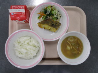 <食材の産地> キャベツ・・・愛知県 にんじん・・・愛知県 玉葱・・・北海道 じゃが芋・・・熊本県 生姜・・・北海道 パセリ・・・静岡県 ※牛乳は、茨城県・千葉県・群馬県・栃木県・北海道・山形県・宮城県の原乳を使用しています。 ※現在出荷制限されている食材については、給食に使用していません。