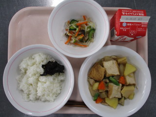 にんじん・・・北海道 じゃがいも・・・北海道 ごぼう・・・・・・青森県 だいこん・・・千葉県 ながねぎ・・・岩手県 こまつな・・・足立区 ※牛乳は、茨城県・千葉県・群馬県・栃木県・北海道・山形県・宮城県の原乳を使用しています。 ※現在出荷制限されている食材については、給食に使用していません。