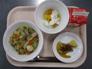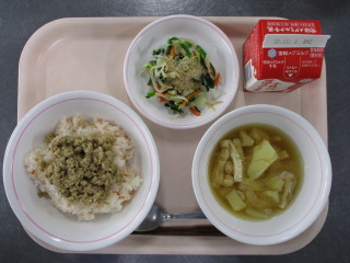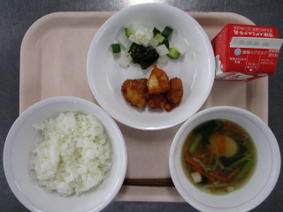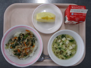 たまねぎ・・・北海道 にんじん・・・北海道 ながねぎ・・・岩手県 にんにく・・・青森県 だいこん・・・北海道 たまねぎ・・・北海道 きゅうり・・・茨城県 もやし・・・栃木県 こまつな・・・茨城県 ※牛乳は、茨城県・千葉県・群馬県・栃木県・北海道・山形県・宮城県の原乳を使用しています。 ※現在出荷制限されている食材については、給食に使用していません。