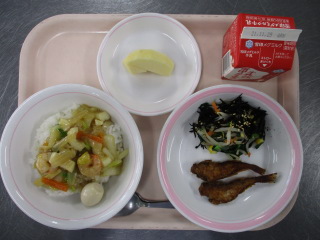 にんじん・・・千葉県 しょうが・・・熊本県 はくさい・・・茨城県 もやし・・・栃木県 たまねぎ・・・北海道 こまつな・・・足立区 ホールコーン・・・北海道 いか・・・ペルー えび・・・ベトナム はたはた・・・兵庫県 ※牛乳は、茨城県・千葉県・群馬県・栃木県・北海道・山形県・宮城県の原乳を使用しています。 ※現在出荷制限されている食材については、給食に使用していません。