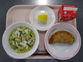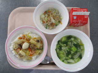 たまねぎ・・・兵庫県 にんじん・・・千葉県 かぶ・・・青森県 エリンギ・・・長野県 しょうが・・・熊本県 きゃべつ・・・愛知県 きゅうり・・・茨城県 ホールコーン・・・北海道 じゃがいも・・・長崎県 ぶたにく・・・千葉県 たまご・・・青森県 ※牛乳は、茨城県・千葉県・群馬県・栃木県・北海道・山形県・宮城県の原乳を使用しています。 ※現在出荷制限されている食材については、給食に使用していません。