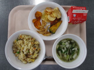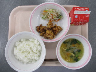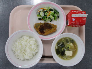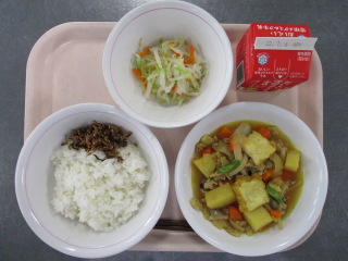 じゃがいも・・・長崎県 たまねぎ・・・兵庫県 にんじん・・・千葉県 さやいんげん・・・沖縄県 きゃべつ・・・茨城県 もやし・・・栃木県 ちりめん・・・兵庫県 ぶたにく・・・千葉県 こめ・・・青森県 ※牛乳は、茨城県・千葉県・群馬県・栃木県・北海道・山形県・宮城県の原乳を使用しています。 ※現在出荷制限されている食材については、給食に使用していません。