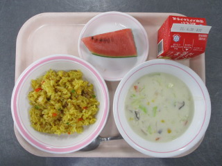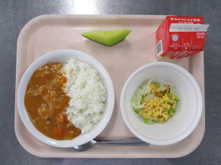 たまねぎ・・・佐賀県 にんじん・・・千葉県 しめじ・・・長野県 にんにく・・・青森県 しょうが・・・熊本県 きゃべつ・・・茨城県 きゅうり・・・茨城県 メロン・・・茨城県 ぶたにく・・・千葉県 こめ・・・青森県 ※牛乳は、茨城県・千葉県・群馬県・栃木県・北海道・山形県・宮城県の原乳を使用しています。 ※現在出荷制限されている食材については、給食に使用していません。