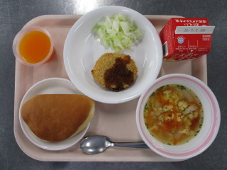 たまねぎ・・・兵庫県 きゃべつ・・・茨城県 にんじん・・・千葉県 じゃがいも・・・長崎県 しょうが・・・熊本県 パセリ・・・長野県 ホールコーン・・・北海道 ぶたにく・・・千葉県 ベーコン・・・千葉県 たまご・・・青森県 ※牛乳は、茨城県・千葉県・群馬県・栃木県・北海道・山形県・宮城県の原乳を使用しています。 ※現在出荷制限されている食材については、給食に使用していません。