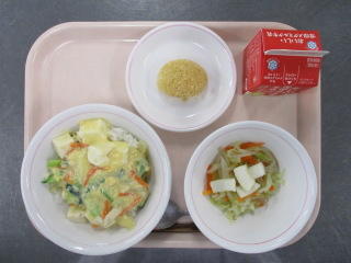 きゃべつ・・・愛知県 玉ねぎ・・・北海道 にんじん・・・千葉県 ホールコーン・・・北海道 こまつな・・・足立区 しめじ・・・長野県 長ねぎ・・・栃木県 ぶり・・・三陸 ハム・・・千葉県 米・・・青森県