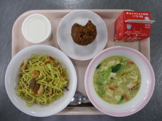 きゃべつ・・・愛知県 もやし・・・栃木県 玉ねぎ・・・北海道 にんじん・・・千葉県 チンゲン菜・・・茨城県 しょうが・・・熊本県 いか・・・ペルー えび・・・インド ぶた肉・・・千葉県 たまご・・・青森県 とり肉・・・山梨県