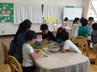 2年生のグリーンピースに続き、今日は、1年生がそら豆のさやむき体験。 楽しそうにみんなでむきむき。2年生と同じように、たくさんあったそら豆のさやもあっという間になくなり、きれいな緑のおまめちゃんがたくさん。