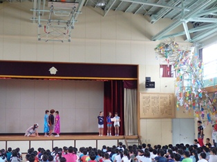 織姫と彦星の物語を劇で演じ、七夕に関するクイズを行いました。体育館には、1・2年生が願い事を書いた短冊や折り紙で作った飾りのついた大きな竹も飾られました。