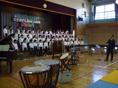 はじめの演奏は、2年生。琴の優雅な演奏と和太鼓による力強い演奏は、和を感じさせる素敵な音色でした。合唱は「こころパレット」で、元気のよい声が響きました。