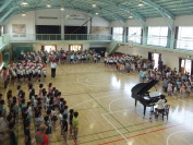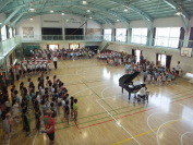 今日の音楽朝会は、「校歌コンクール」です。1年生から6年生までが学年ごとに校歌を歌って、審査員が審査します。みんな大きな声で元気よく歌いました。どの学年もとても上手でしたが、1位は1年生、2位は2年生でした。1年生は、校歌を練習したばかりでしたが、みんな歌詞をしっかり覚えて、自信に満ちた歌声でした。